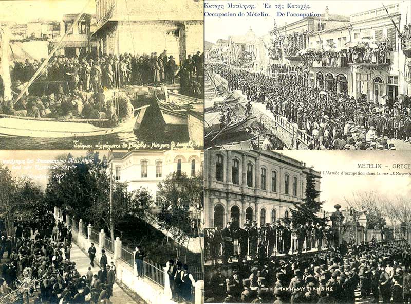 8 Νοεμβρίου 1912: "Ναυτικό άγημα και δύναμη στρατού από 1.000 άνδρες, υπό τον Αλέξανδρο Μανουσάκη, που επέβαιναν στο θωρηκτό ""Αβέρωφ"" και σε τρία επίτακτα ατμόπλοια, αποβιβάζονται στις 14:00 στη Μυτιλήνη. Η Τουρκική φρουρά, αποτελούμενη από 2.000 άνδρες, συμπτύσσεται στο εσωτερικό του νησιού, όπου και υποχρεώνεται να παραδοθεί στις 8 Δεκεμβρίου 1912, μετά από μάχη στην περιοχή.... του χωριού Κλαπάδος. Έτσι ολόκληρη η Λέσβος καθίσταται πλέον ελεύθερη."