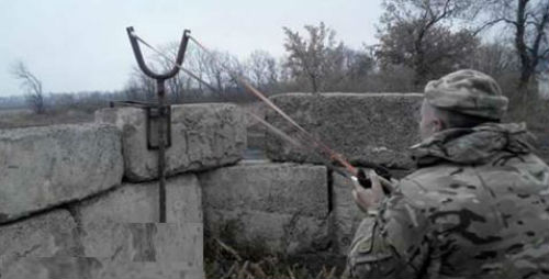 «Πολεμιστές στην Αντιτρομοκρατική Επιχείρηση χτυπούν τον ειρηνικό πληθυσμό στην Ντονμπάς αντί με άρματα μάχης και οβίδες με ένα νεότερο όπλο: Μία γιγάντια σφεντόνα», σημειώνει το δημοσίευμα.